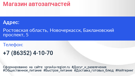Магазин автозапчастей по адресу Ростовская область, Новочеркасск, Баклановский проспект, 5 в дальнейшем Организация, размещена в следующих категориях: