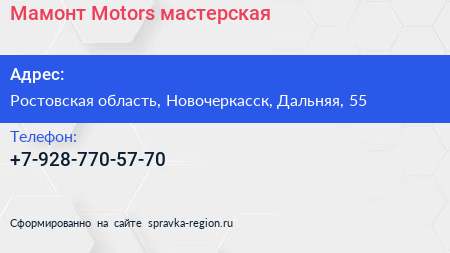 Мамонт Motors, мастерская по адресу Ростовская область, Новочеркасск, Дальняя, 55 в дальнейшем Организация, размещена в следующих категориях: