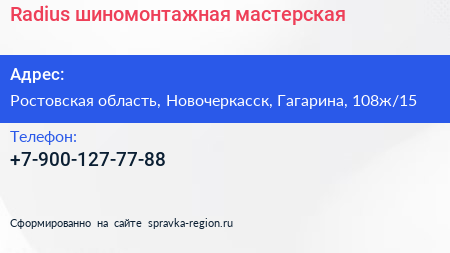 Radius, шиномонтажная мастерская по адресу Ростовская область, Новочеркасск, Гагарина, 108ж/15 в дальнейшем Организация, размещена в следующих категориях: