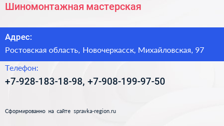 Шиномонтажная мастерская по адресу Ростовская область, Новочеркасск, Михайловская, 97 в дальнейшем Организация, размещена в следующих категориях: