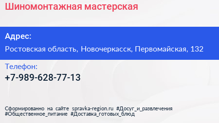 Шиномонтажная мастерская по адресу Ростовская область, Новочеркасск, Первомайская, 132 в дальнейшем Организация, размещена в следующих категориях: