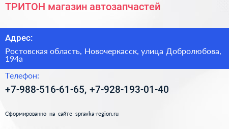ТРИТОН, магазин автозапчастей по адресу Ростовская область, Новочеркасск, улица Добролюбова, 194а в дальнейшем Организация, размещена в следующих категориях: