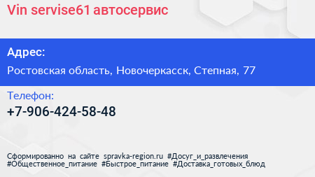Vin-servise61, автосервис по адресу Ростовская область, Новочеркасск, Степная, 77 в дальнейшем Организация, размещена в следующих категориях:
