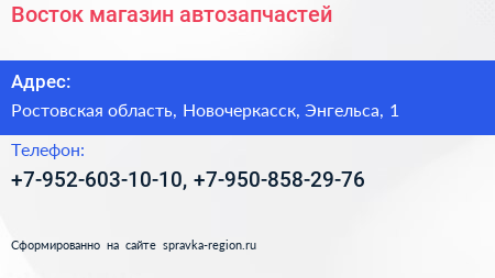 Восток, магазин автозапчастей по адресу Ростовская область, Новочеркасск, Энгельса, 1 в дальнейшем Организация, размещена в следующих категориях: