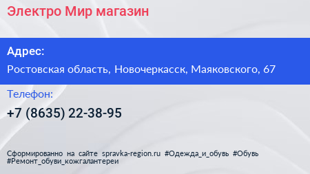 Электро Мир, магазин по адресу Ростовская область, Новочеркасск, Маяковского, 67 в дальнейшем Организация, размещена в следующих категориях: