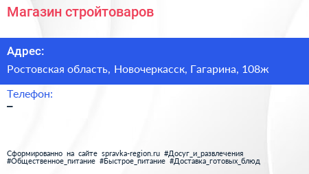 Магазин стройтоваров по адресу Ростовская область, Новочеркасск, Гагарина, 108ж в дальнейшем Организация, размещена в следующих категориях: