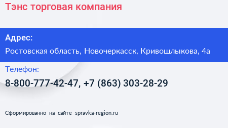 Тэнс, торговая компания по адресу Ростовская область, Новочеркасск, Кривошлыкова, 4а в дальнейшем Организация, размещена в следующих категориях: