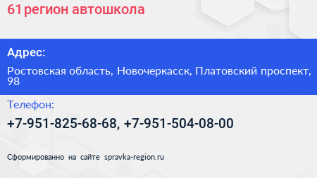 61 регион, автошкола по адресу Ростовская область, Новочеркасск, Платовский проспект, 98 в дальнейшем Организация, размещена в следующих категориях: