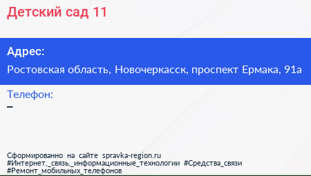 Детский сад №11 по адресу Ростовская область, Новочеркасск, проспект Ермака, 91а в дальнейшем Организация, размещена в следующих категориях: