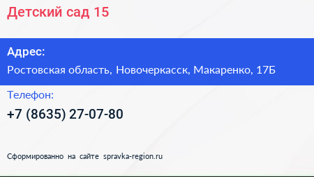 Детский сад №15 по адресу Ростовская область, Новочеркасск, Макаренко, 17Б в дальнейшем Организация, размещена в следующих категориях: