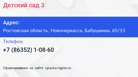 Детский сад №3 по адресу Ростовская область, Новочеркасск, Бабушкина, 65/15 в дальнейшем Организация, размещена в следующих категориях: