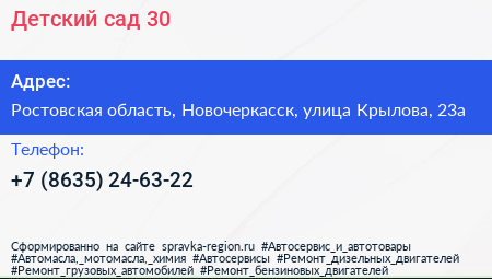 Детский сад №30 по адресу Ростовская область, Новочеркасск, улица Крылова, 23а в дальнейшем Организация, размещена в следующих категориях: