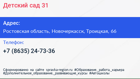 Детский сад №31 по адресу Ростовская область, Новочеркасск, Троицкая, 66 в дальнейшем Организация, размещена в следующих категориях: