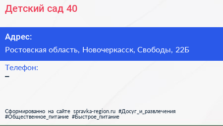 Детский сад №40 по адресу Ростовская область, Новочеркасск, Свободы, 22Б в дальнейшем Организация, размещена в следующих категориях: