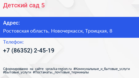 Детский сад №5 по адресу Ростовская область, Новочеркасск, Троицкая, 8 в дальнейшем Организация, размещена в следующих категориях: