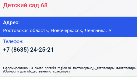 Детский сад №68 по адресу Ростовская область, Новочеркасск, Ленгника, 9 в дальнейшем Организация, размещена в следующих категориях: