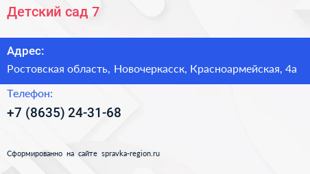 Детский сад №7 по адресу Ростовская область, Новочеркасск, Красноармейская, 4а в дальнейшем Организация, размещена в следующих категориях: