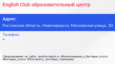 English Club, образовательный центр по адресу Ростовская область, Новочеркасск, Московская улица, 20 в дальнейшем Организация, размещена в следующих категориях: