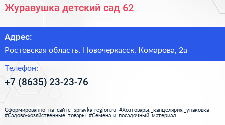 Журавушка, детский сад №62 по адресу Ростовская область, Новочеркасск, Комарова, 2а в дальнейшем Организация, размещена в следующих категориях:
