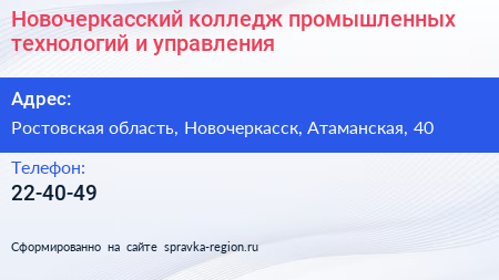 Новочеркасский колледж промышленных технологий и управления по адресу Ростовская область, Новочеркасск, Атаманская, 40 в дальнейшем Организация, размещена в следующих категориях: