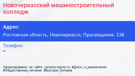 Новочеркасский машиностроительный колледж по адресу Ростовская область, Новочеркасск, Просвещения, 138 в дальнейшем Организация, размещена в следующих категориях: