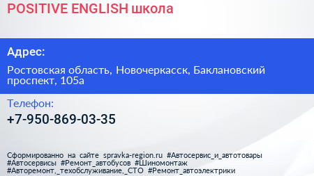 POSITIVE ENGLISH, школа по адресу Ростовская область, Новочеркасск, Баклановский проспект, 105а в дальнейшем Организация, размещена в следующих категориях: