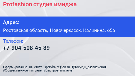 Profashion, студия имиджа по адресу Ростовская область, Новочеркасск, Калинина, 65а в дальнейшем Организация, размещена в следующих категориях: