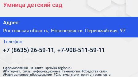 Умница, детский сад по адресу Ростовская область, Новочеркасск, Первомайская, 97 в дальнейшем Организация, размещена в следующих категориях: