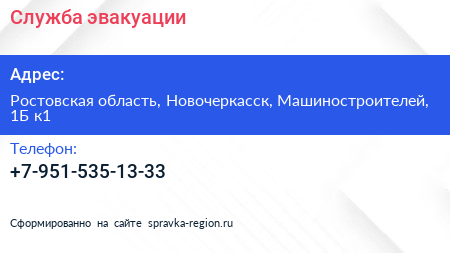 Служба эвакуации по адресу Ростовская область, Новочеркасск, Машиностроителей, 1Б к1 в дальнейшем Организация, размещена в следующих категориях: