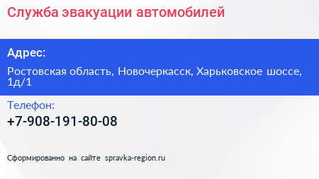 Служба эвакуации автомобилей по адресу Ростовская область, Новочеркасск, Харьковское шоссе, 1д/1 в дальнейшем Организация, размещена в следующих категориях: