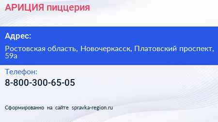 АРИЦИЯ, пиццерия по адресу Ростовская область, Новочеркасск, Платовский проспект, 59а в дальнейшем Организация, размещена в следующих категориях: