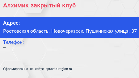 Алхимик, закрытый клуб по адресу Ростовская область, Новочеркасск, Пушкинская улица, 37 в дальнейшем Организация, размещена в следующих категориях: