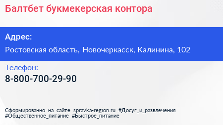 Балтбет, букмекерская контора по адресу Ростовская область, Новочеркасск, Калинина, 102 в дальнейшем Организация, размещена в следующих категориях: