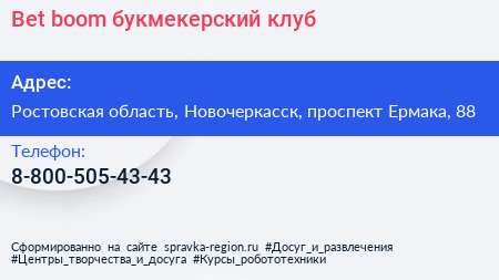 Bet boom, букмекерский клуб по адресу Ростовская область, Новочеркасск, проспект Ермака, 88 в дальнейшем Организация, размещена в следующих категориях:
