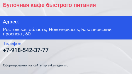 Булочная, кафе быстрого питания по адресу Ростовская область, Новочеркасск, Баклановский проспект, 60 в дальнейшем Организация, размещена в следующих категориях: