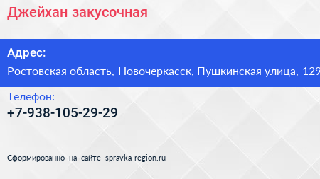 Джейхан, закусочная по адресу Ростовская область, Новочеркасск, Пушкинская улица, 129 в дальнейшем Организация, размещена в следующих категориях:
