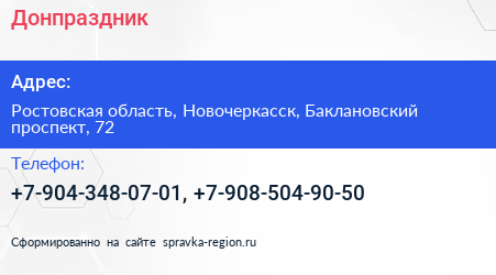 Донпраздник по адресу Ростовская область, Новочеркасск, Баклановский проспект, 72 в дальнейшем Организация, размещена в следующих категориях: