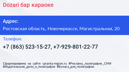 Dozari, бар-караоке по адресу Ростовская область, Новочеркасск, Магистральная, 20 в дальнейшем Организация, размещена в следующих категориях: