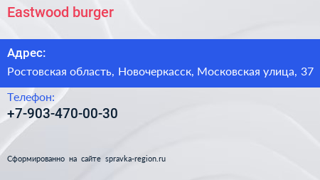 Eastwood burger по адресу Ростовская область, Новочеркасск, Московская улица, 37 в дальнейшем Организация, размещена в следующих категориях: