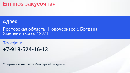 Em & mos, закусочная по адресу Ростовская область, Новочеркасск, Богдана Хмельницкого, 122/1 в дальнейшем Организация, размещена в следующих категориях: