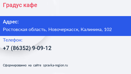 Градус, кафе по адресу Ростовская область, Новочеркасск, Калинина, 102 в дальнейшем Организация, размещена в следующих категориях: