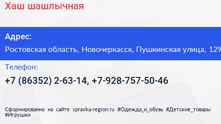 Хаш, шашлычная по адресу Ростовская область, Новочеркасск, Пушкинская улица, 129 в дальнейшем Организация, размещена в следующих категориях:
