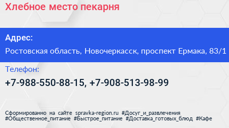 Хлебное место, пекарня по адресу Ростовская область, Новочеркасск, проспект Ермака, 83/1 в дальнейшем Организация, размещена в следующих категориях: