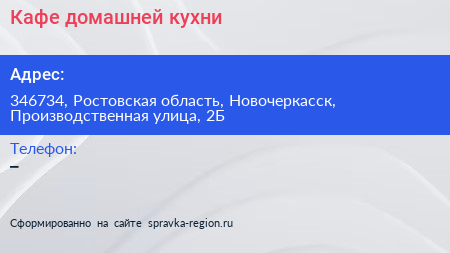 Кафе домашней кухни по адресу 346734, Ростовская область, Новочеркасск, Производственная улица, 2Б в дальнейшем Организация, размещена в следующих категориях: