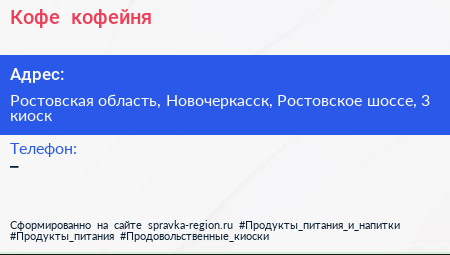 Кофе+, кофейня по адресу Ростовская область, Новочеркасск, Ростовское шоссе, 3 киоск в дальнейшем Организация, размещена в следующих категориях: