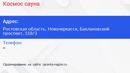Космос, сауна по адресу Ростовская область, Новочеркасск, Баклановский проспект, 118/3 в дальнейшем Организация, размещена в следующих категориях: