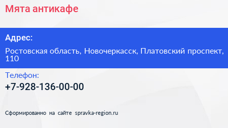 Мята, антикафе по адресу Ростовская область, Новочеркасск, Платовский проспект, 110 в дальнейшем Организация, размещена в следующих категориях: