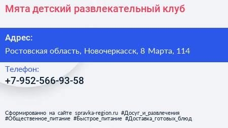 Мята, детский развлекательный клуб по адресу Ростовская область, Новочеркасск, 8 Марта, 114 в дальнейшем Организация, размещена в следующих категориях: