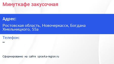 Минуткафе, закусочная по адресу Ростовская область, Новочеркасск, Богдана Хмельницкого, 55а в дальнейшем Организация, размещена в следующих категориях: