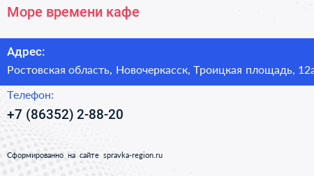 Море времени, кафе по адресу Ростовская область, Новочеркасск, Троицкая площадь, 12а в дальнейшем Организация, размещена в следующих категориях: